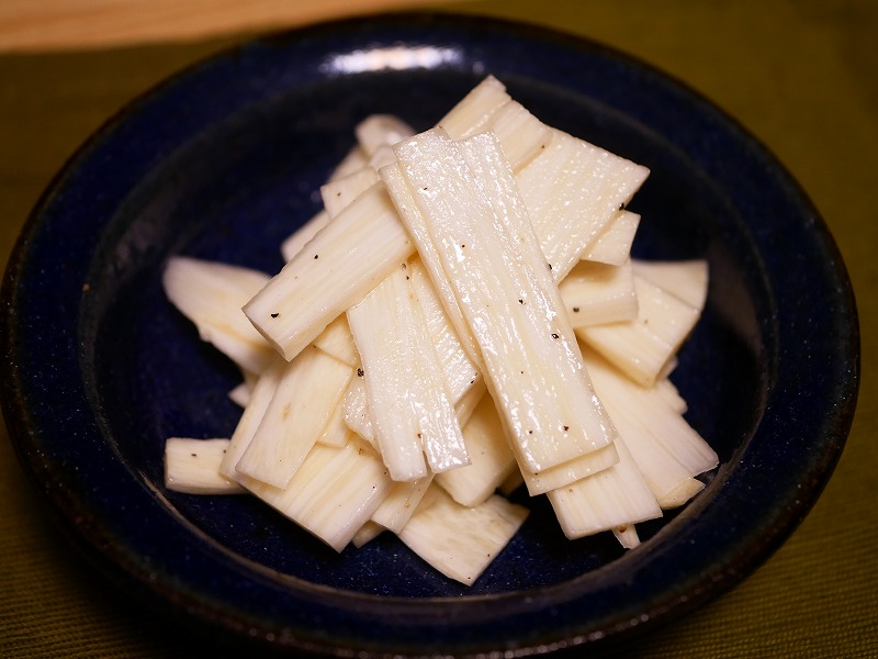 薄くスライスした真菰竹に、中華スープの素、ごま油、酢、塩、コショウを混ぜた