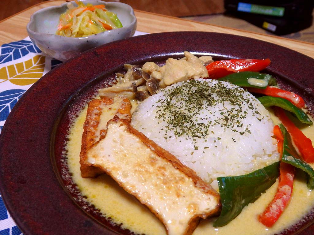 <チキンと厚揚げのタイ風グリーンカレー、なんちゃってザワークラウト>