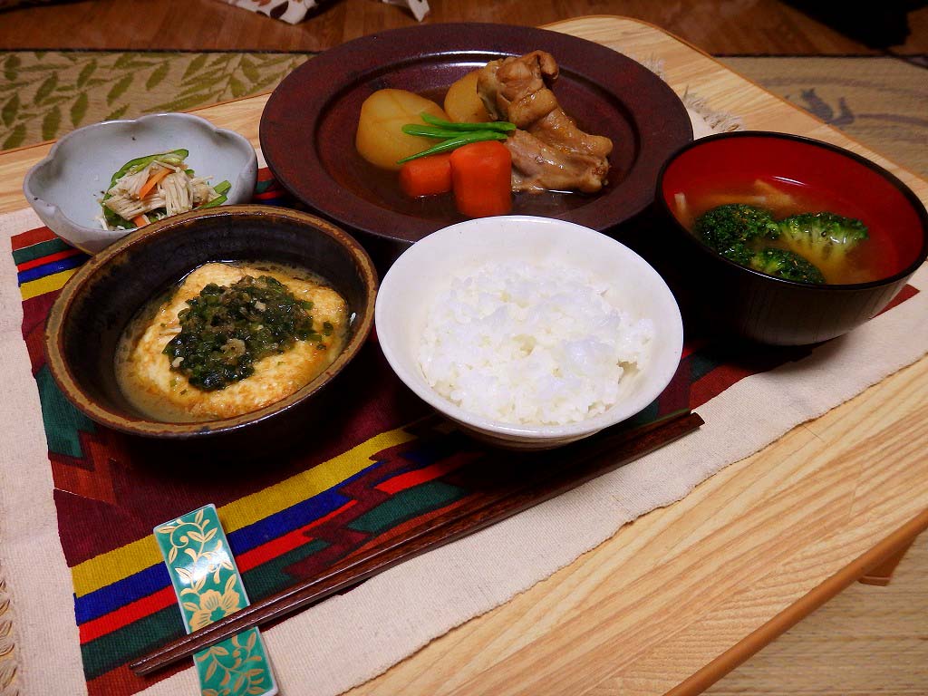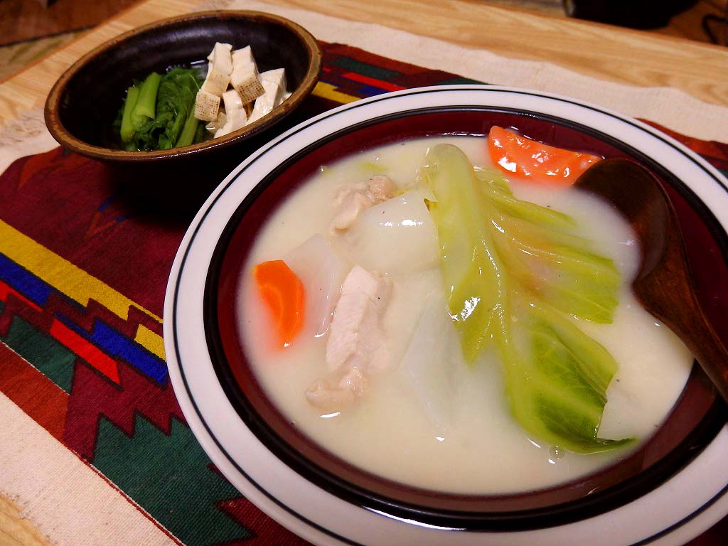 <カブのシチュー、カブの葉と焼き豆腐の煮びたし>