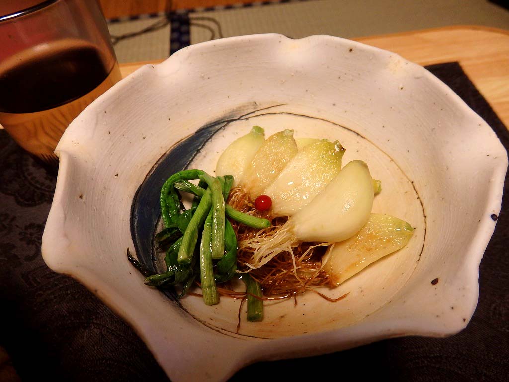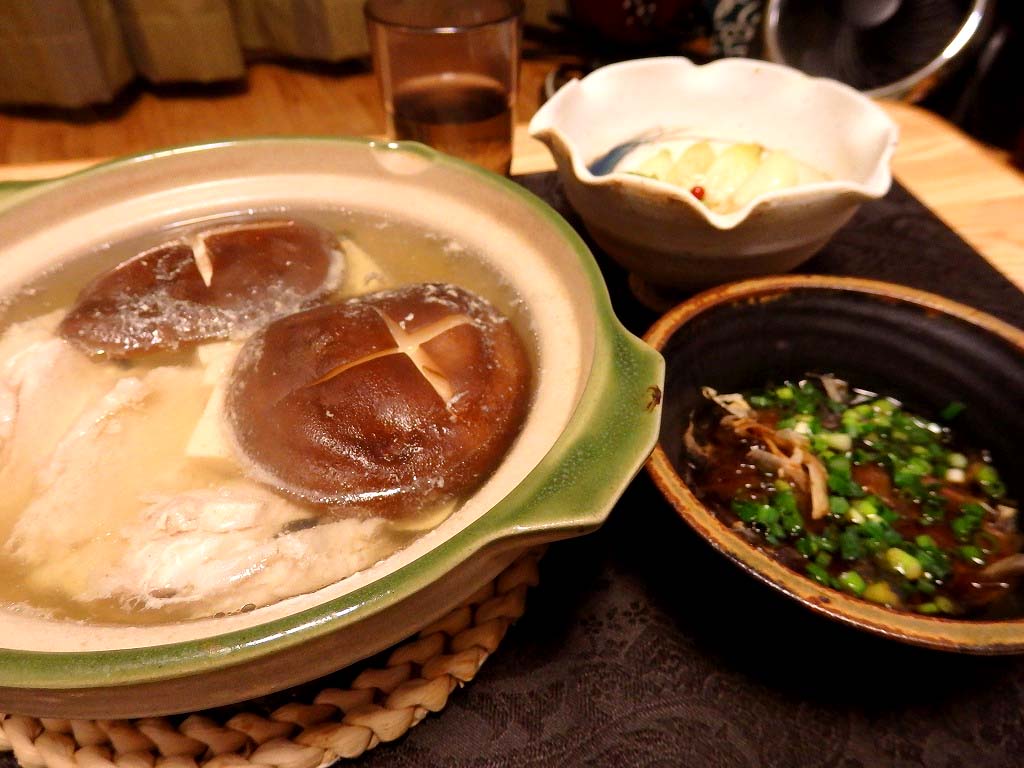 <びっくり椎茸の湯豆腐、発芽にんにくのマリネ>