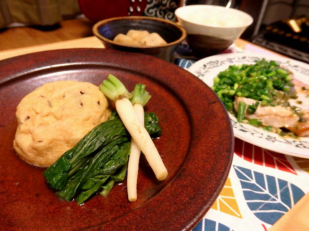 今回は、甘辛くこっくり煮たがんもどきと、あっさり出汁で煮た大根菜を