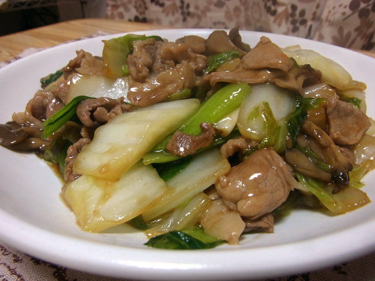 白菜、チンゲンサイを豚肉とともにオイスターソースでこっくり、