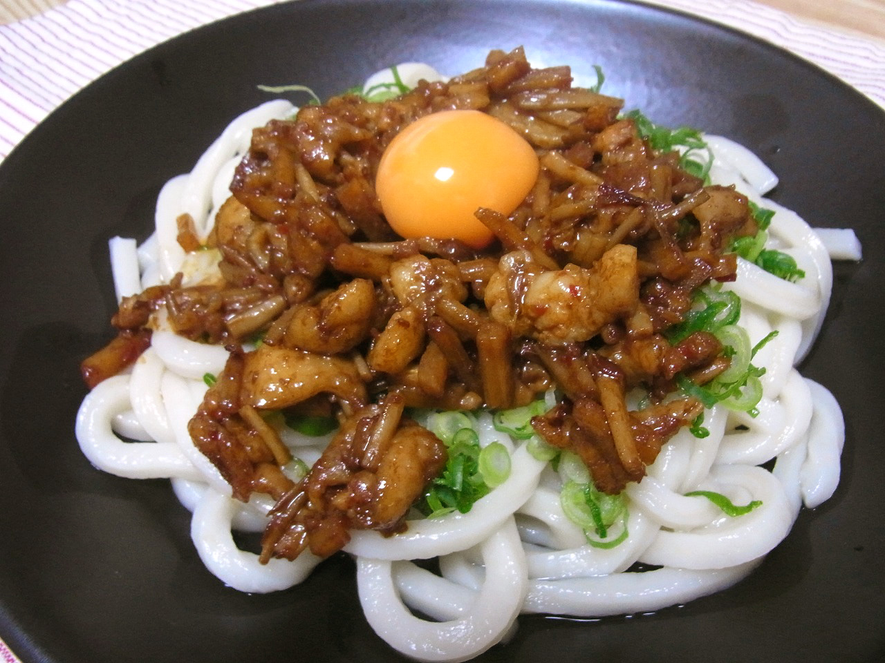 うどんと絡めた、鉄板の逸品。みじん切りの味えのきも地味にいい仕事してます。