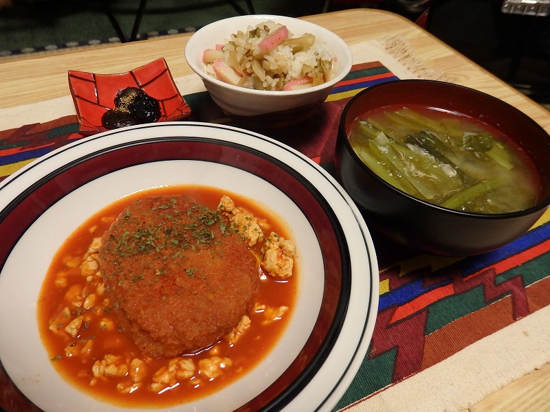 <洋食屋さんふうコロッケのトマトジュース煮、ザワクラとかまぼこの菜飯>