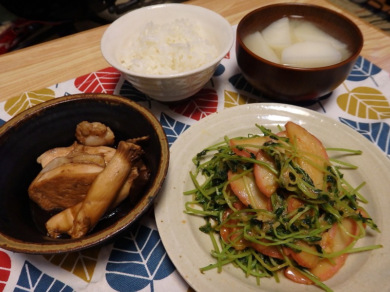<エリンギと鶏胸肉の甘酢煮、豆苗とかまぼこのにんにく味噌炒め、長芋汁>