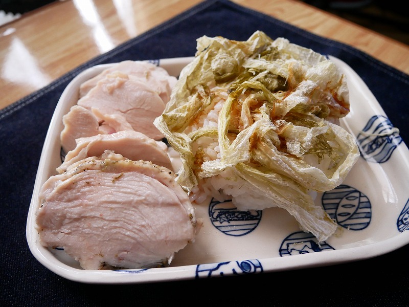 <鶏ハムとおぼろ昆布ご飯の朝食>