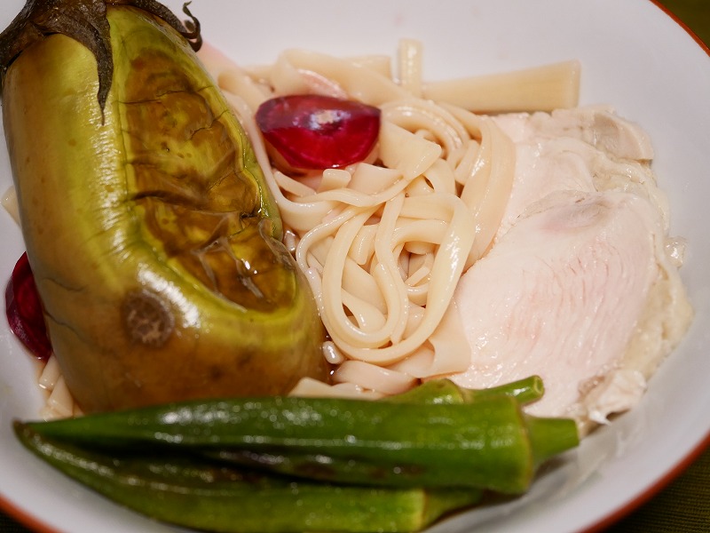 茹でたオクラ、鶏ハムを刻んだものとおぼろ昆布、麺つゆを薄めたものを合わせ、