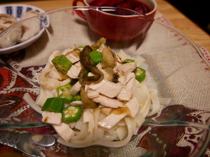 <おくらとおぼろ昆布と鶏ハムのネバネバうどん>
