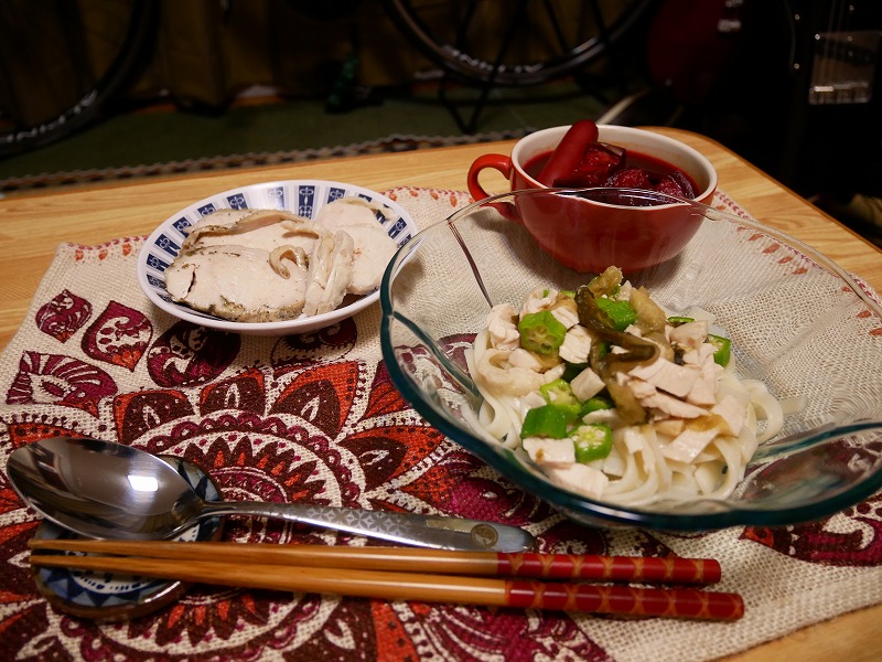 <鶏ハムとビーツと夏野菜と乱短のサラダ風うどん>