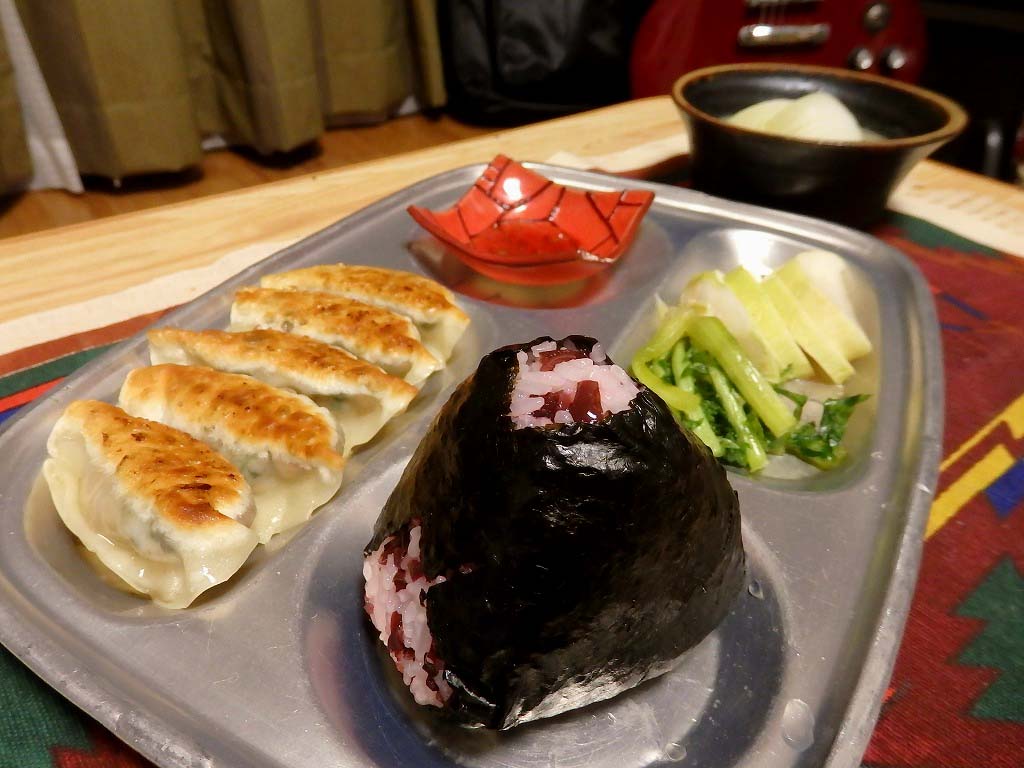 <パクチーごぼうツナ餃子、柴漬けおにぎり、玉ねぎゴロゴロ味噌汁、お漬物>