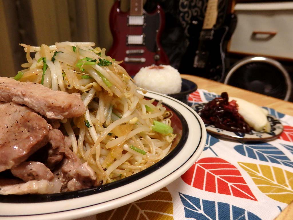 もやしをどばっと2袋投入、酒、中華スープの素、醤油で味を付けて塩で調えます。