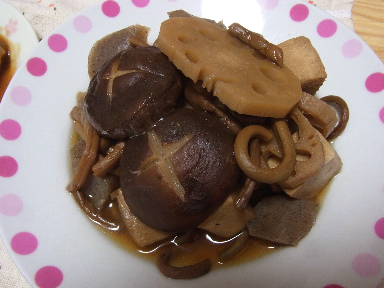 しいたけ、れんこん、ぜんまい、こんにゃく、高野豆腐、鶏肉が入ってます。