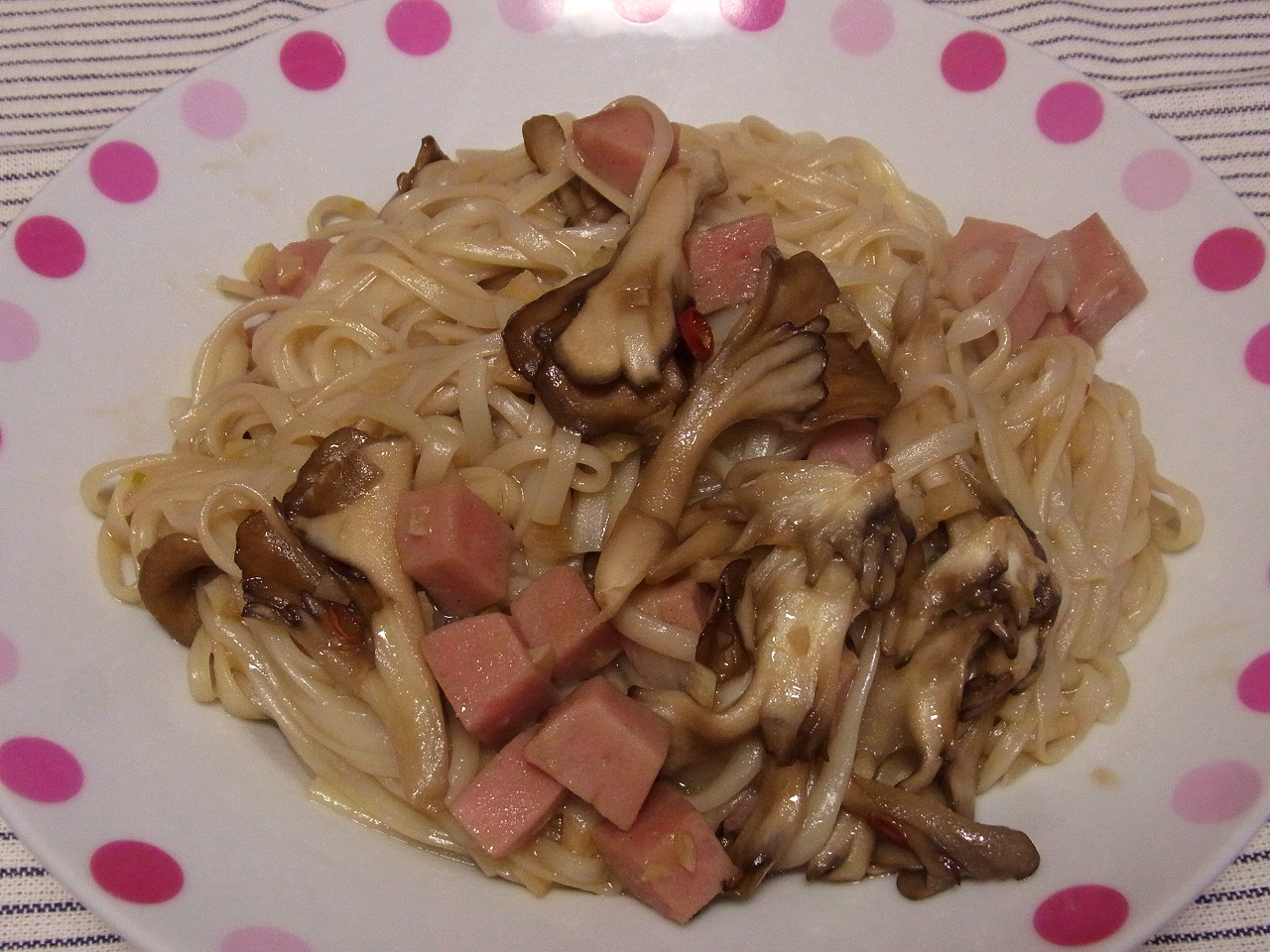 <トレネッテと舞茸、ボロニアソーセージのペペロンチーノ>