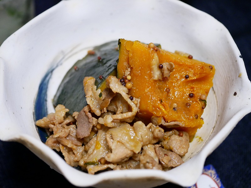 かぼちゃと豚肉のさっぱり煮は、醤油、酒、レモンジャム、マスタード、水少量でたれを作り、