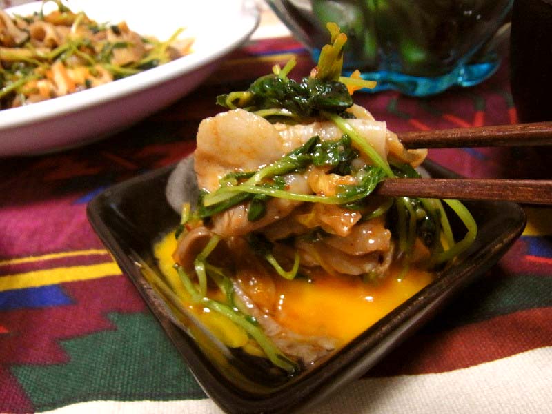 夏と言えばのそら豆とともに、卵黄を付けていただく豆苗のキムチ炒め、