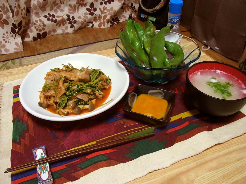 <豆苗とキムチの炒め、茹でそら豆、大根と卵白のスープ>