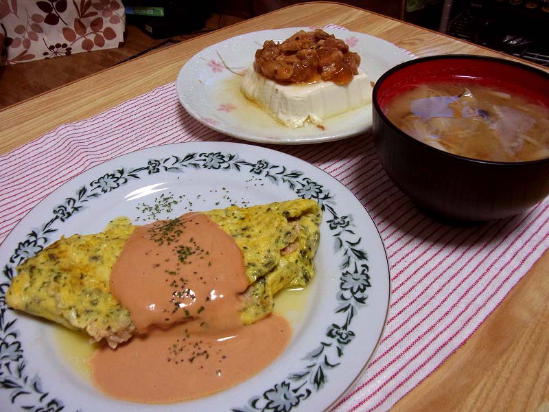 <ツナオムレツのオーロラソース風、焼き鳥缶詰の温奴>
