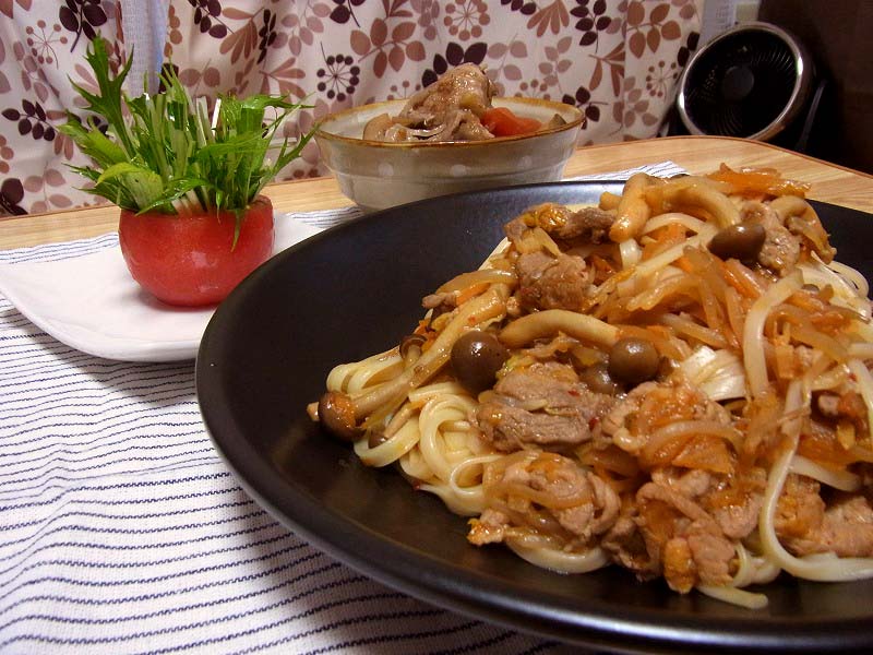 <キムチでピリ辛ソーメンチャンプルー、水菜のナムル>
