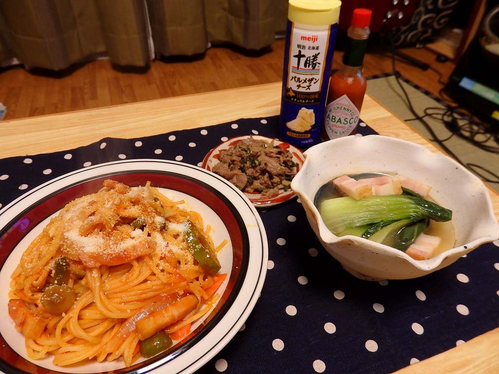 <ナポリタン、牛肉とパセリの炒め、チンゲンサイのコンソメ煮>