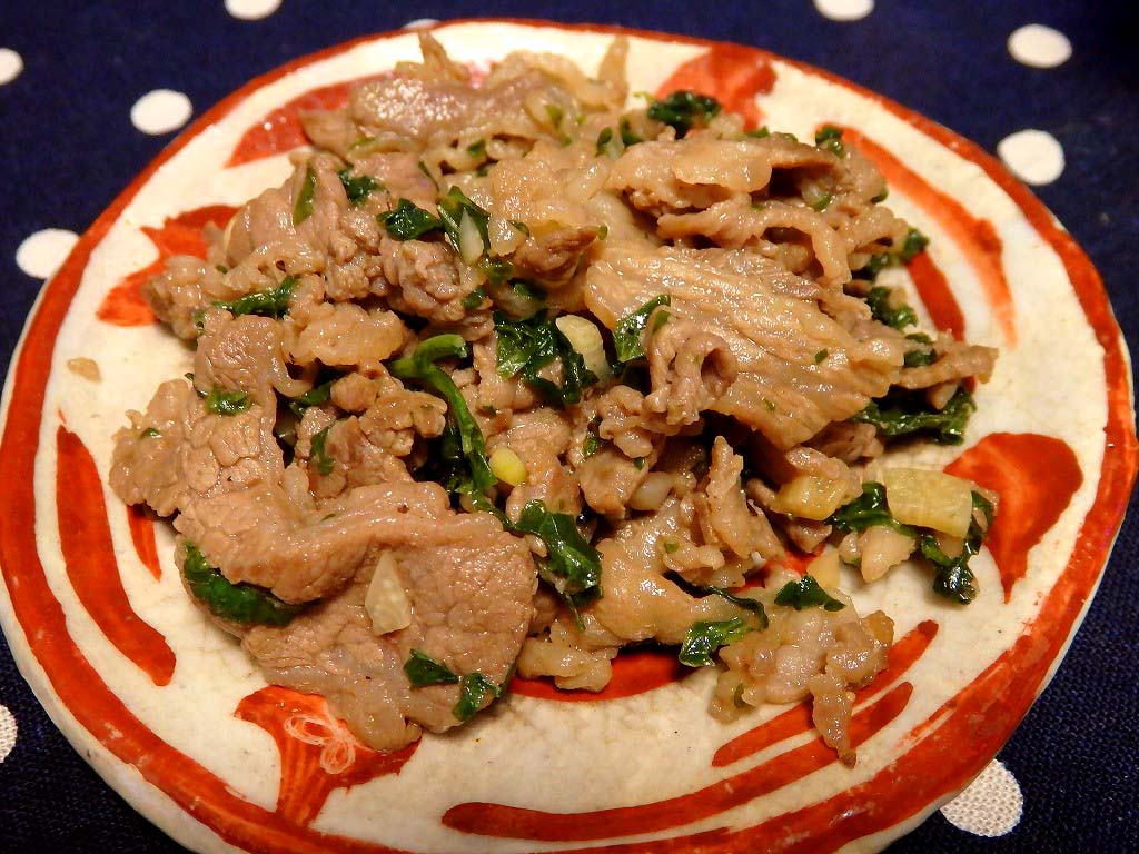 細かく切った牛肉、ニンニクとともに炒めて、