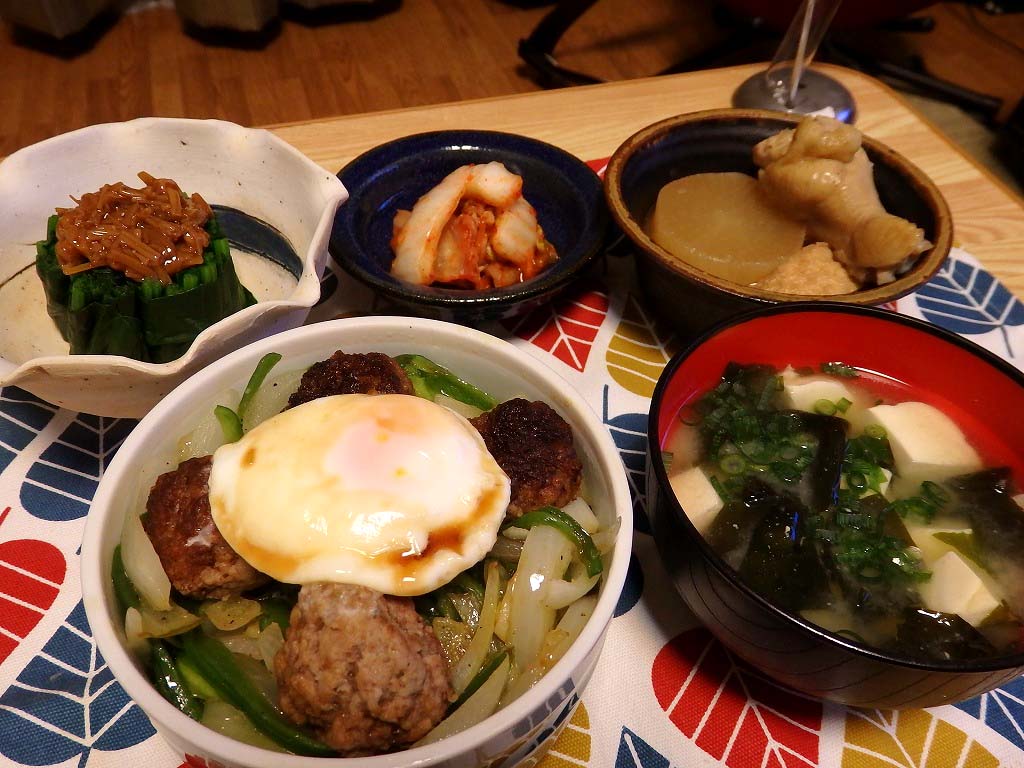 <温玉と肉団子のどんぶり、ほうれん草のなめたけ和え、白菜のキムチ和え>