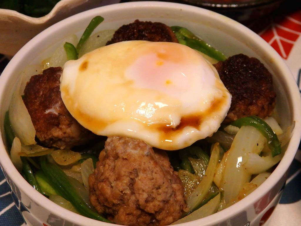 温玉と肉団子のどんぶりは、ご飯の上に炒めた玉ねぎ、ピーマン、肉団子、温玉を乗せ