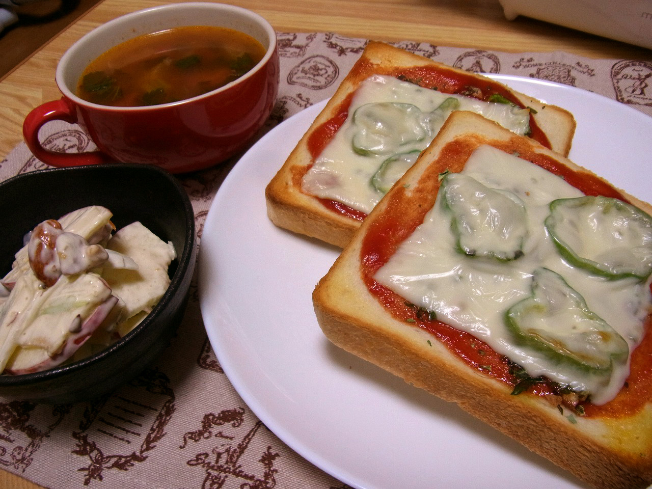 <ピザトースト、セロリとリンゴのサラダ、トマトスープ>