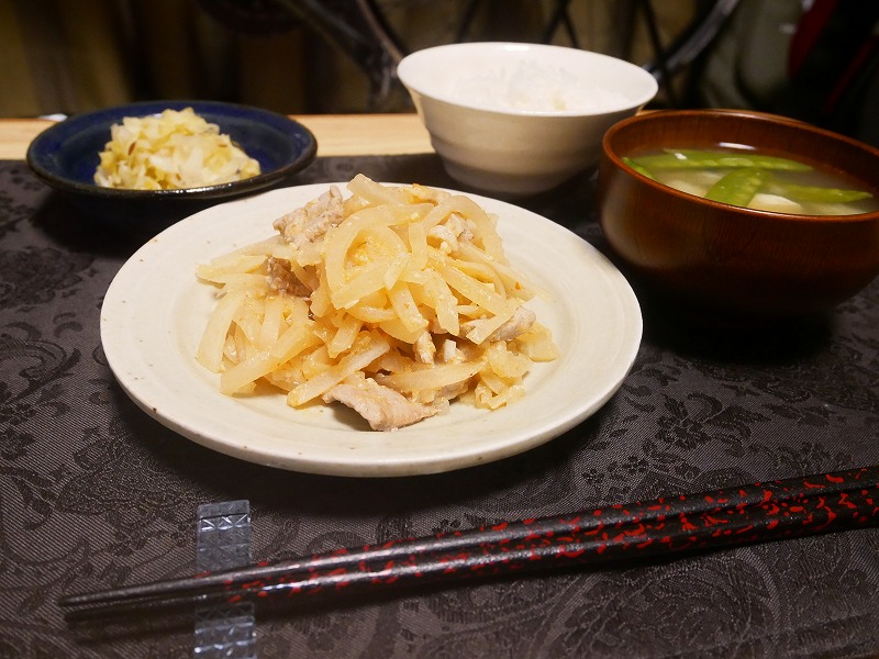 <大根細切りと豚ひれのピリ辛味噌炒め、絹さやと豆腐の味噌汁、ザワクラ>