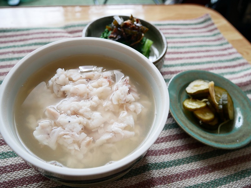 <鯛だし茶漬け、からし菜おひたしの出汁ガラ佃煮和え、まいね家キューちゃん>