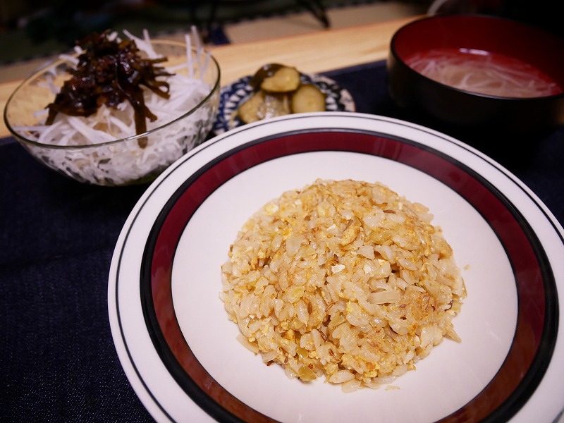 <ザワクラチャーハン、出汁ガラ佃煮の大根サラダ、鯛だしと大根の吸い物>