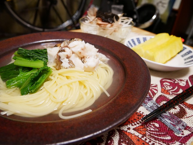 スパゲティに乗せ、熱々の昆布だしをかけました。