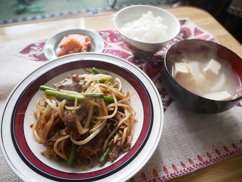 牛肉、にんにくの芽、もやしを炒めます。もう、鉄板でしょう!