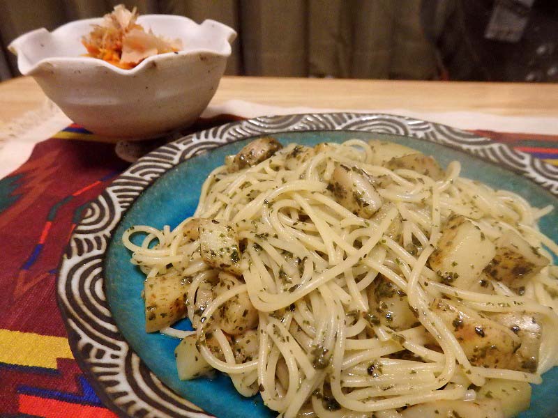 <ポテトとホタテのジェノベーゼ、にんじんしりしり>