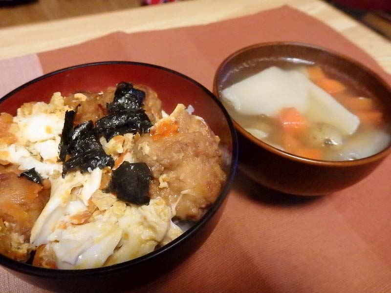 <唐揚げの卵とじ丼、ジャガイモと水餃子の中華スープ>