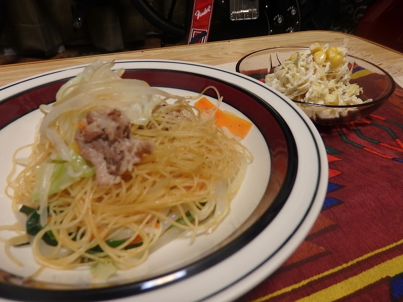 <ケンミンの焼きビーフン(また)+切り干し大根とザワクラのサラダ>