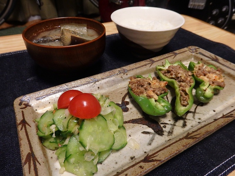 ・ピーマン(いただきもの)のキムチそぼろマヨ詰め焼き