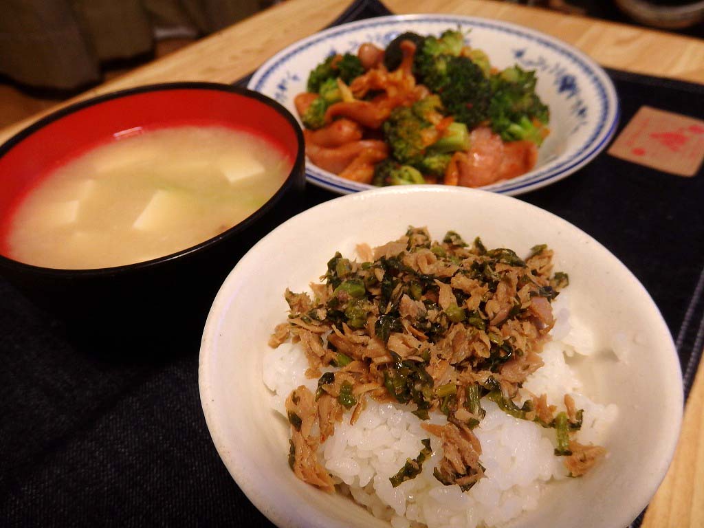 <ブロッコリーとソーセージのキムチ炒め、蕪の葉とツナの生ふりかけ>