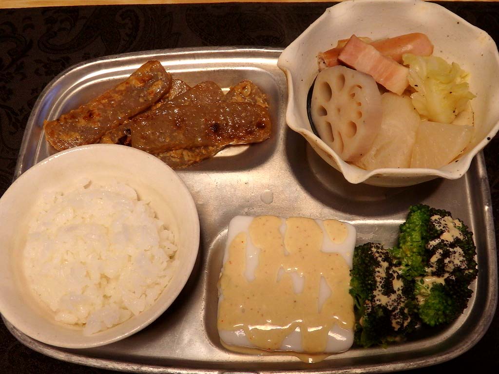 <春キャベツと根菜のポトフ、こんにゃくのにんにく味噌炒め、ジーマミー豆腐>