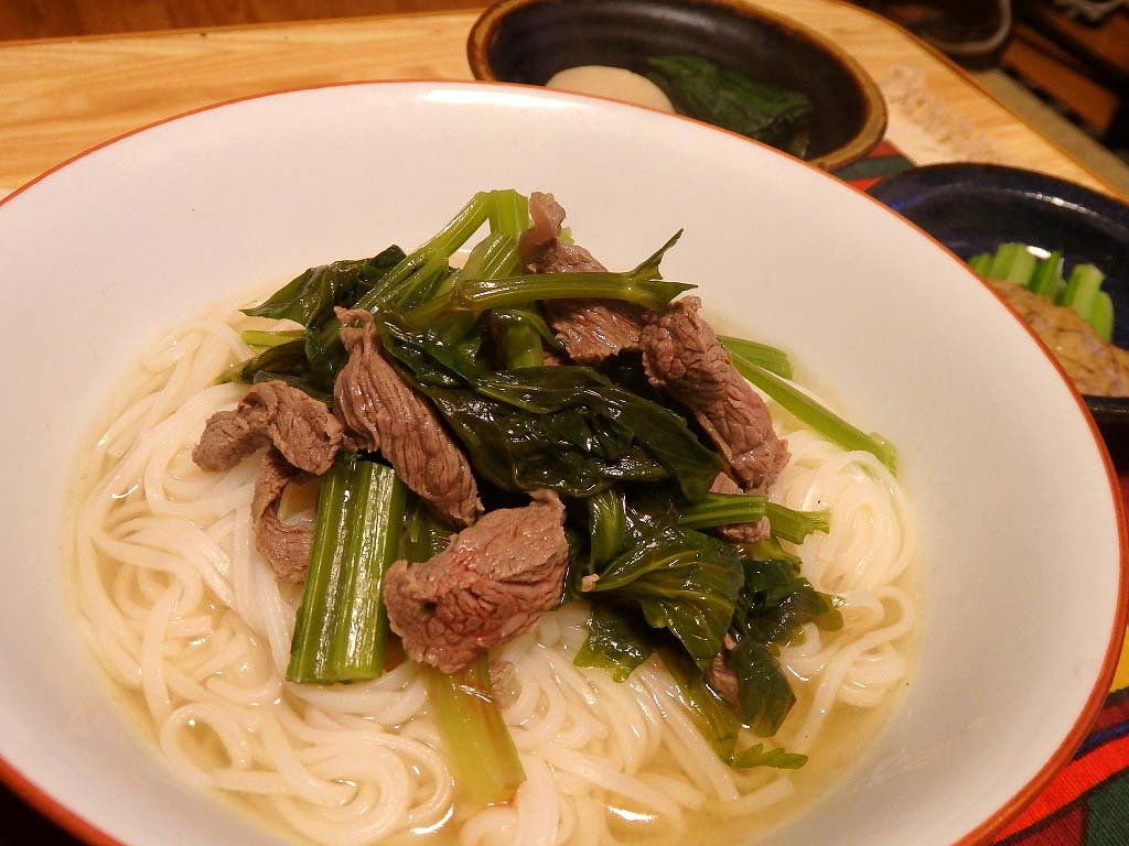 中華スープの素でさっとゆでた牛肉、セロリをビーフンにぶっかけて、