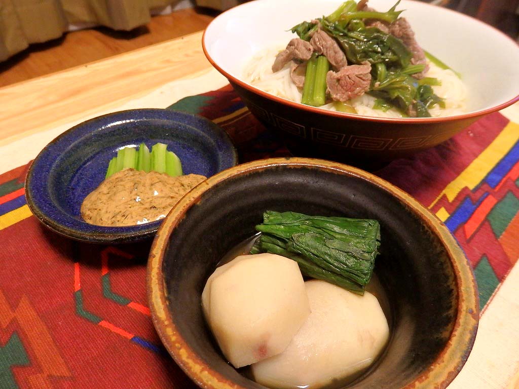 <牛肉とセロリの汁ビーフン、白芽芋と菊菜の炊きあわせ、のりマヨセロリ>