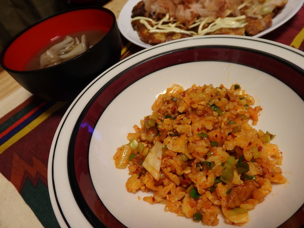 <たこのみ焼き、チャンジャ半チャーハン、まいたけの味噌汁>