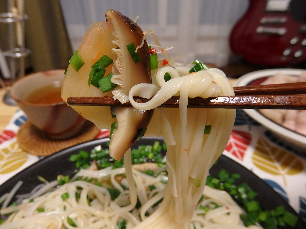 韓国風汁ソーメンは、青ニラ、キムチ、ごま油少々などをかけたそうめん(トレネッテ)を