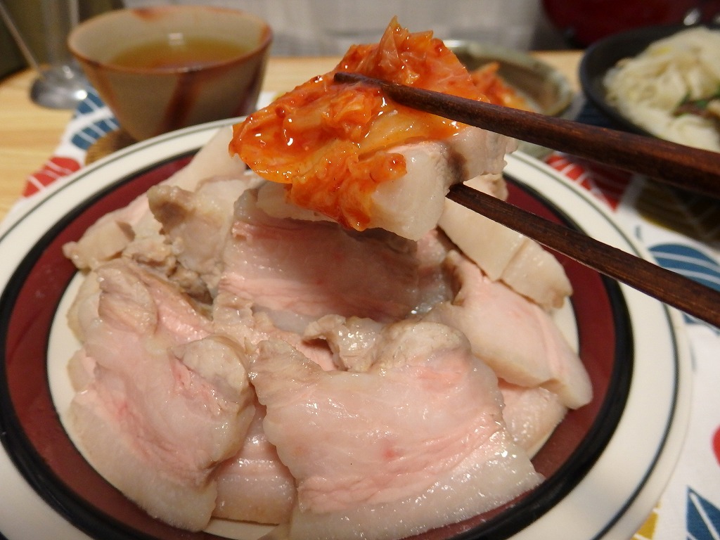 豚肉を湯がいたスープとともにいただきます。絵面がアレだったので写真は載せてませんが、