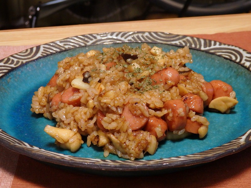 にんにく、刻み玉ねぎ、ソーセージを炒めたところにタテソースを投入、