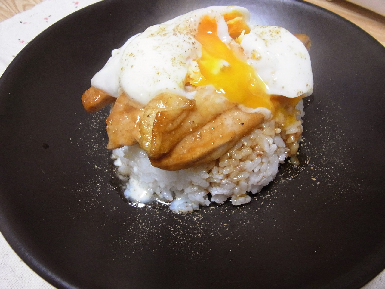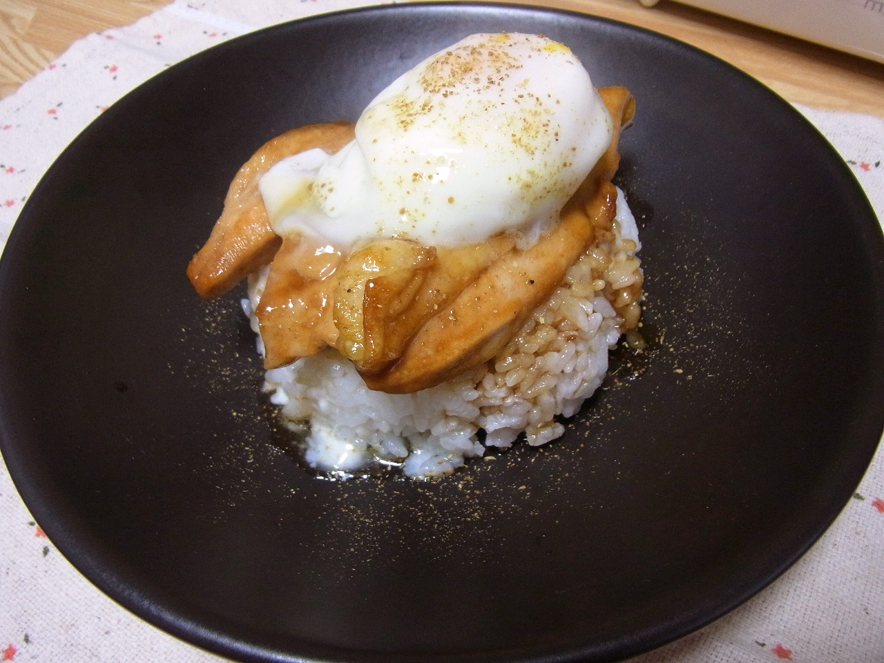ご飯の上に鶏胸肉の照り焼き、温玉を乗せて、仕上げに山椒。