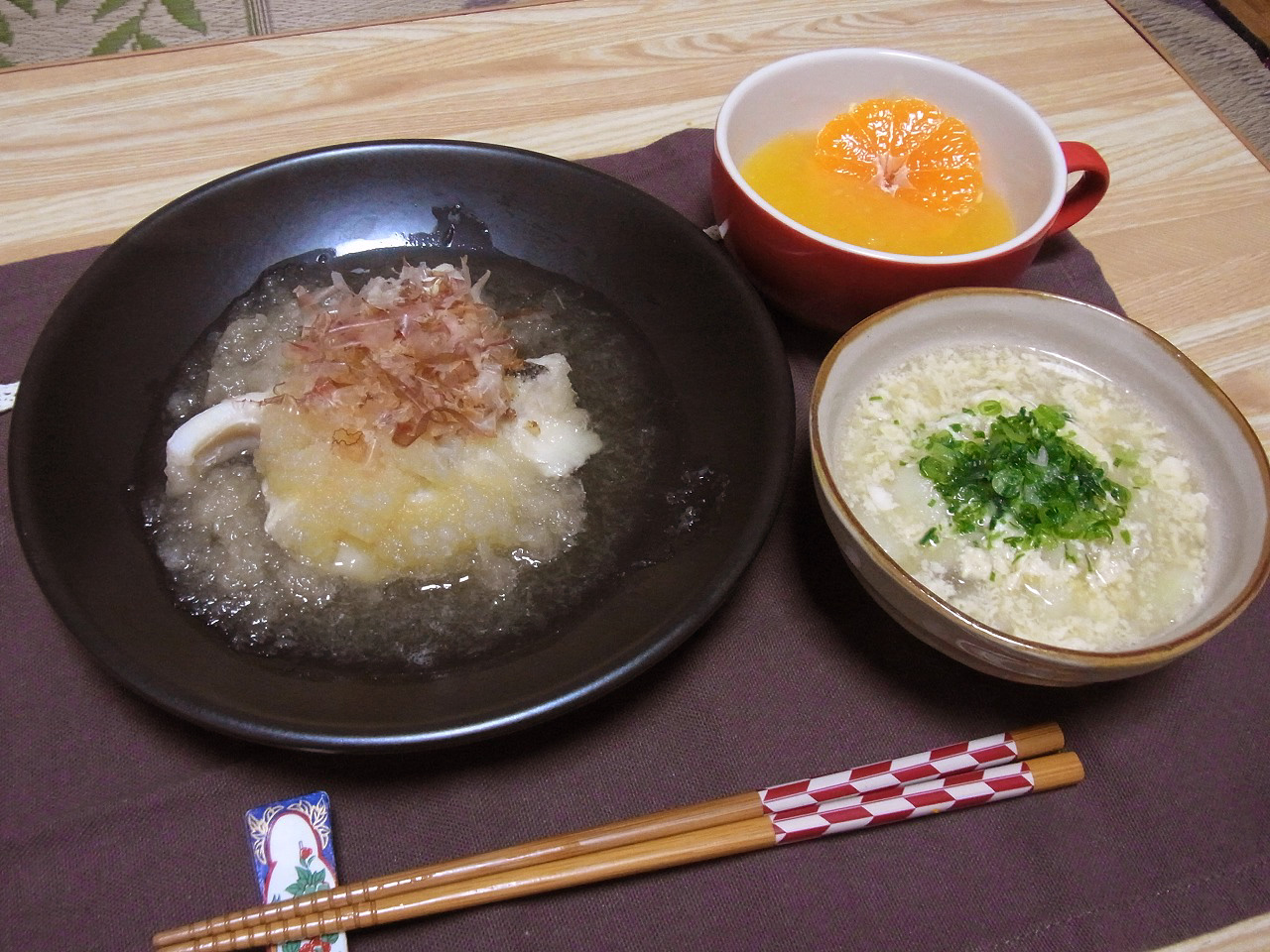 <鱈のみぞれ煮、粗つぶしじゃがいものかき玉スープ、みかんと生姜の葛湯>