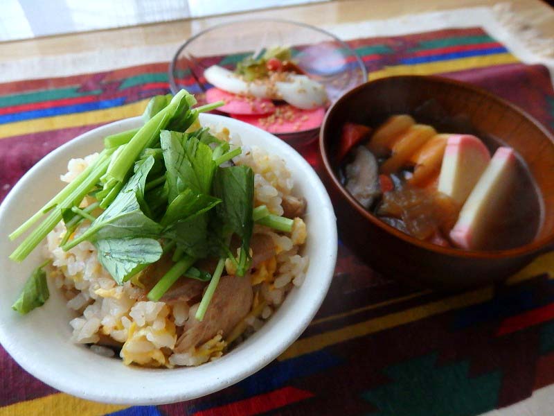 <親子混ぜ込みご飯、かまぼこ汁>