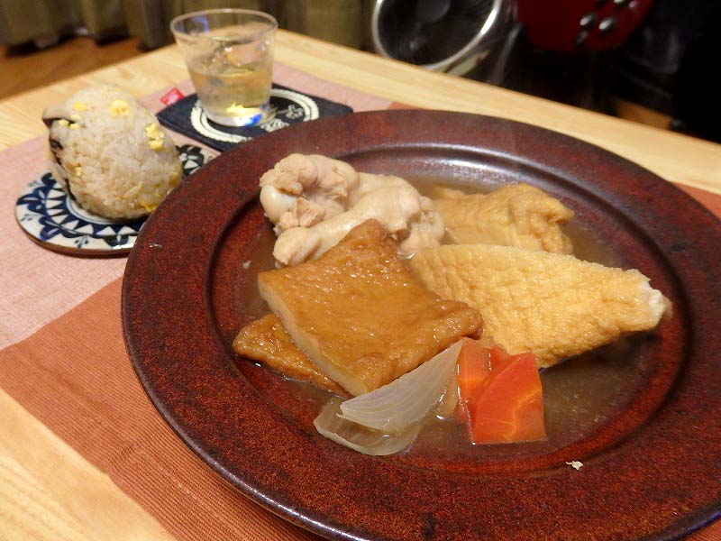 最強スープを継ぎ足しして煮物に。手羽元、厚揚げ、角天、人参、玉ねぎを入れています。