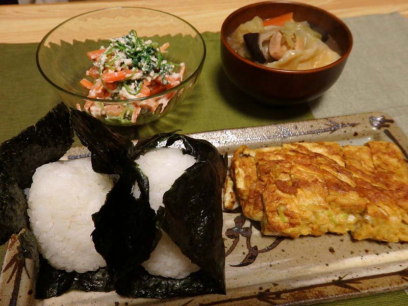 <ひっつみ、人参丸ごとの白和え、ねぎ醤油の玉子焼き>