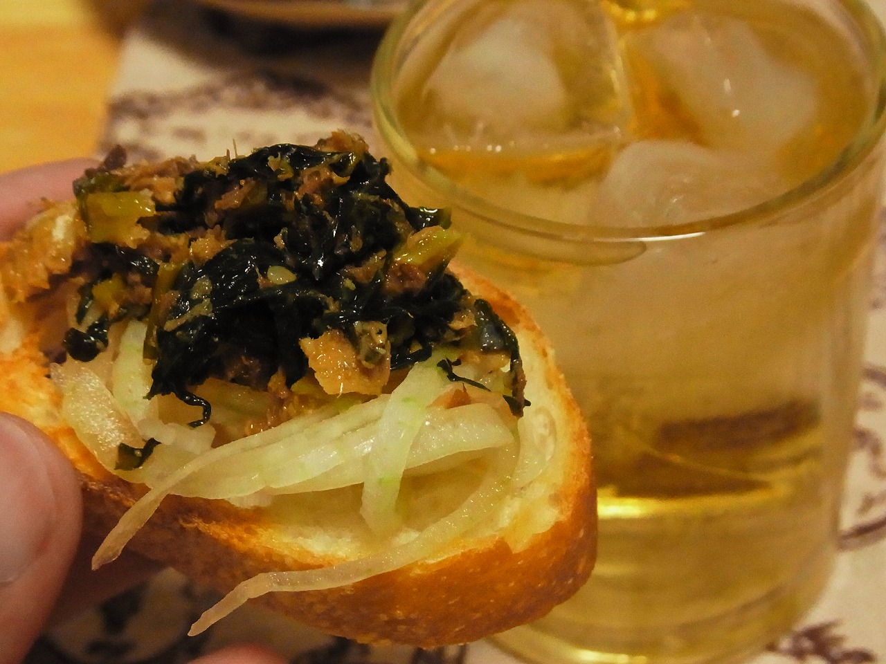 こんがり焼いたバタールの上に新玉ねぎのスライス、生ふりかけを乗せていただきます。